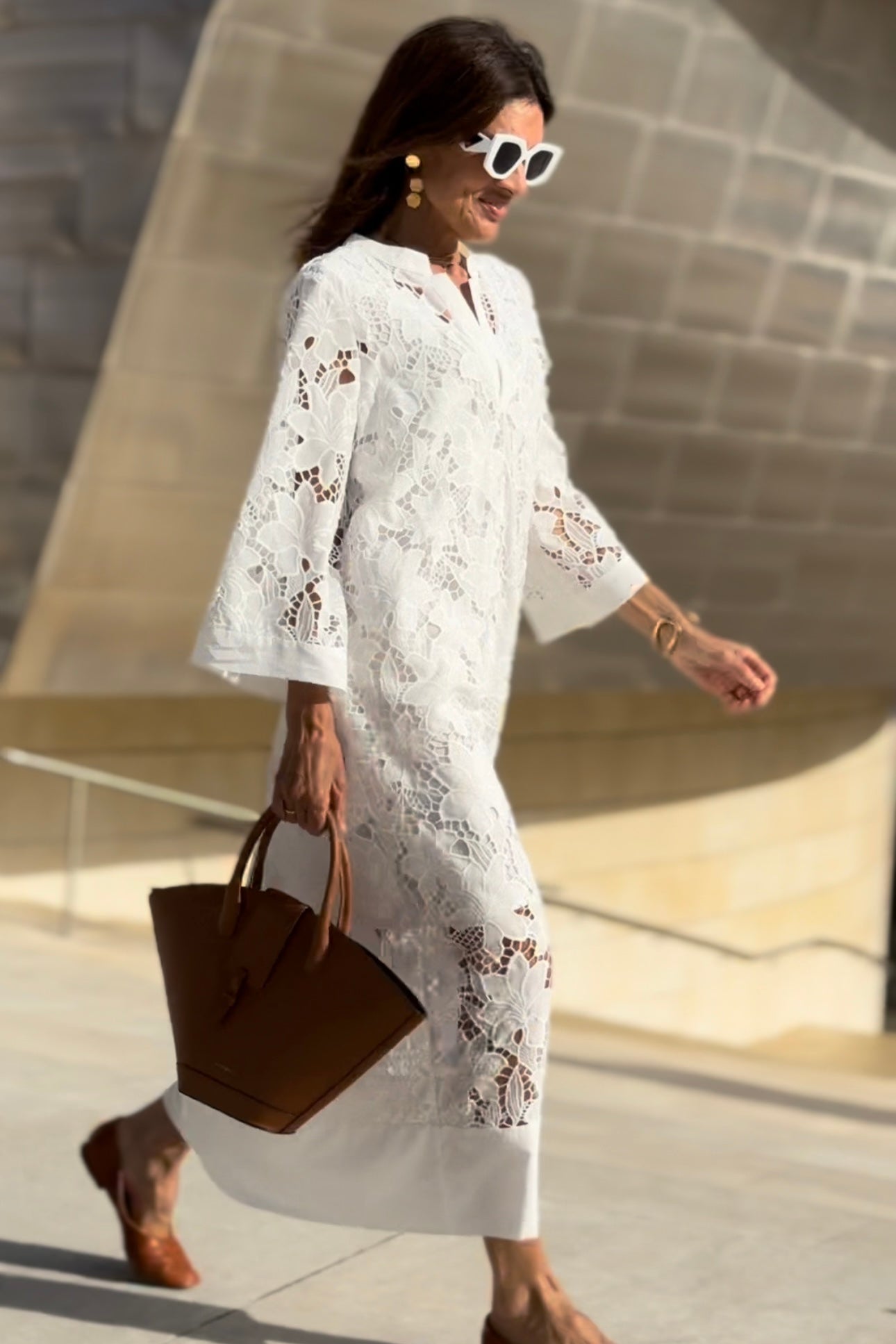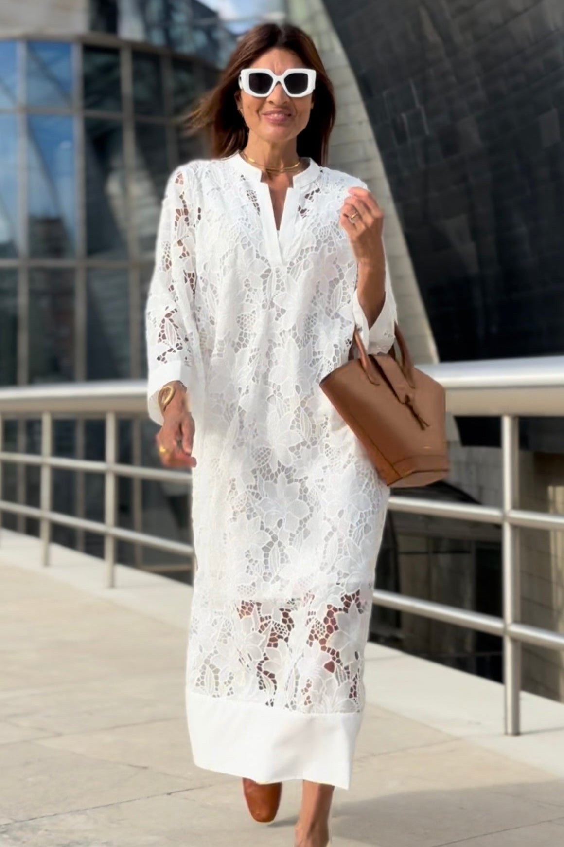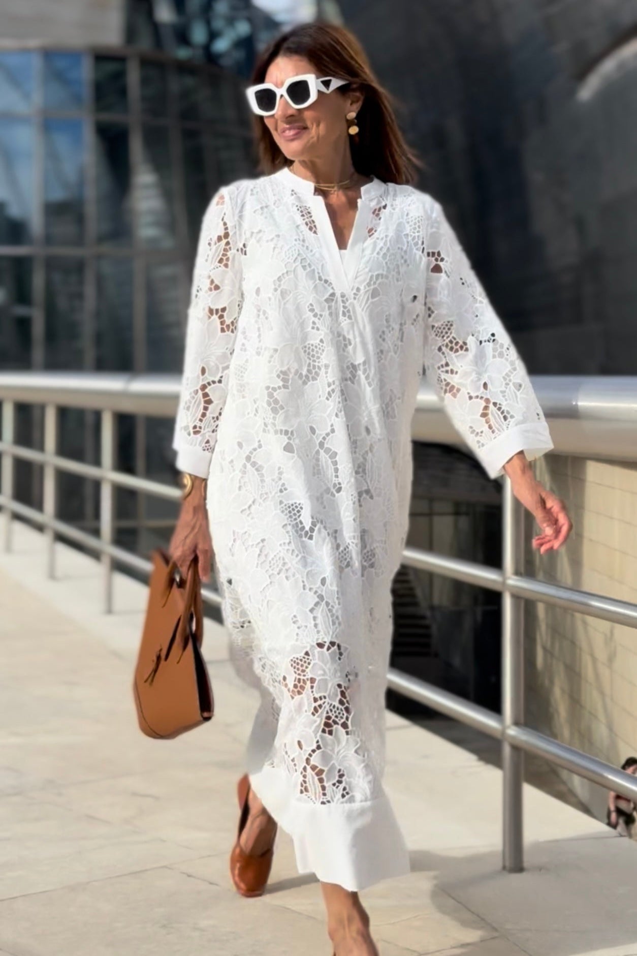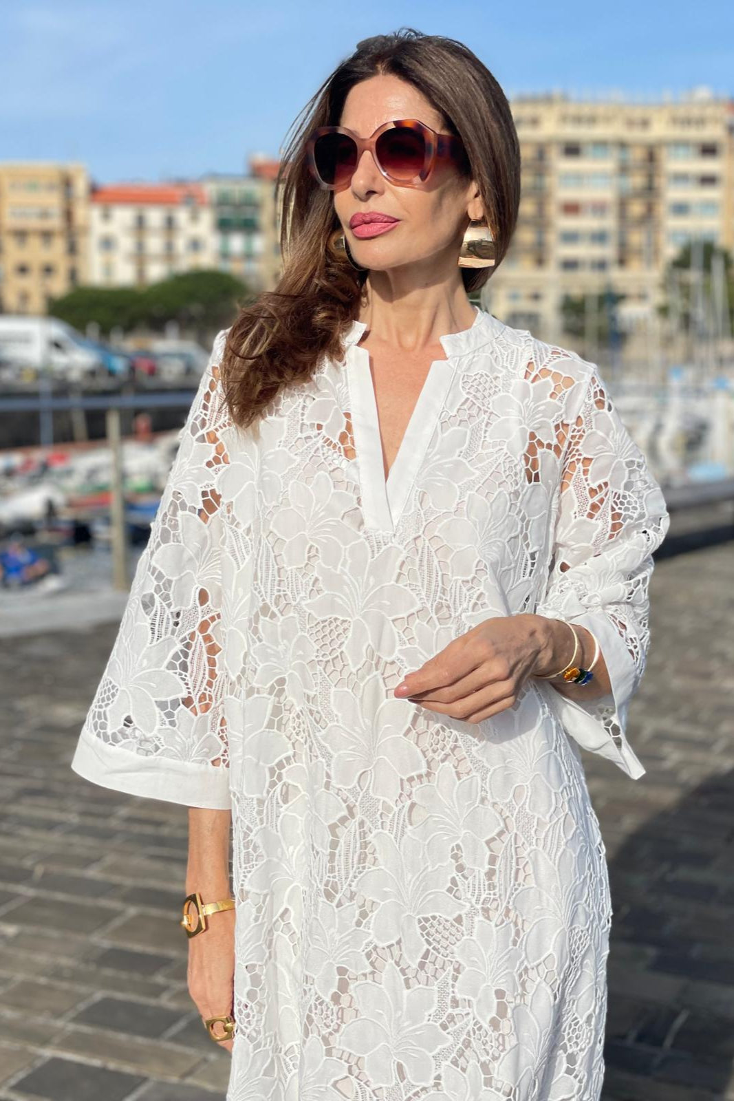 Deze elegante witte jurk van verfijnd bloemenkant ademt luchtigheid en stijl. De rechte, relaxte pasvorm en midi-lengte maken haar ideaal voor een zonnige strandwandeling, een lunchdate aan zee of een zwoele zomeravond op vakantie. De subtiele doorkijkdetails geven de jurk een vrouwelijke touch zonder in te boeten aan comfort. Combineer met sandalen en de Solea strandtas voor een effortless chic look.