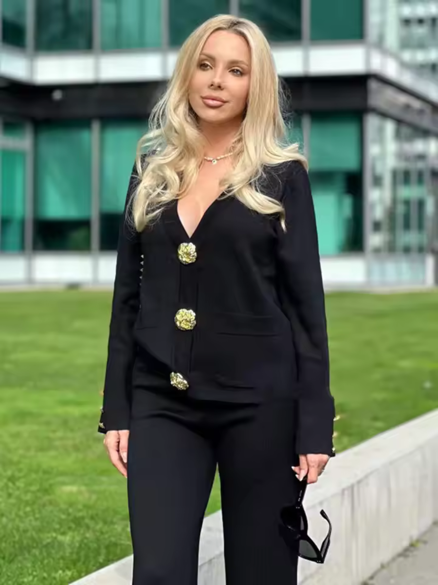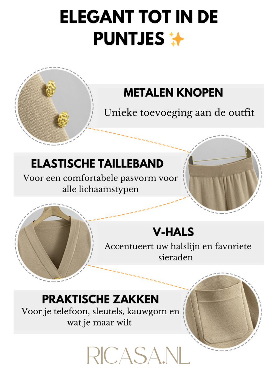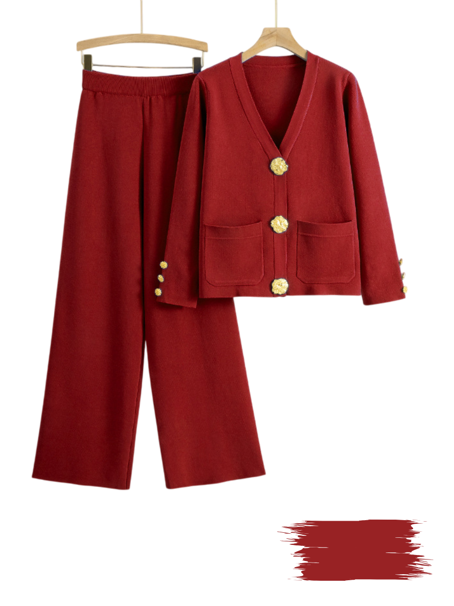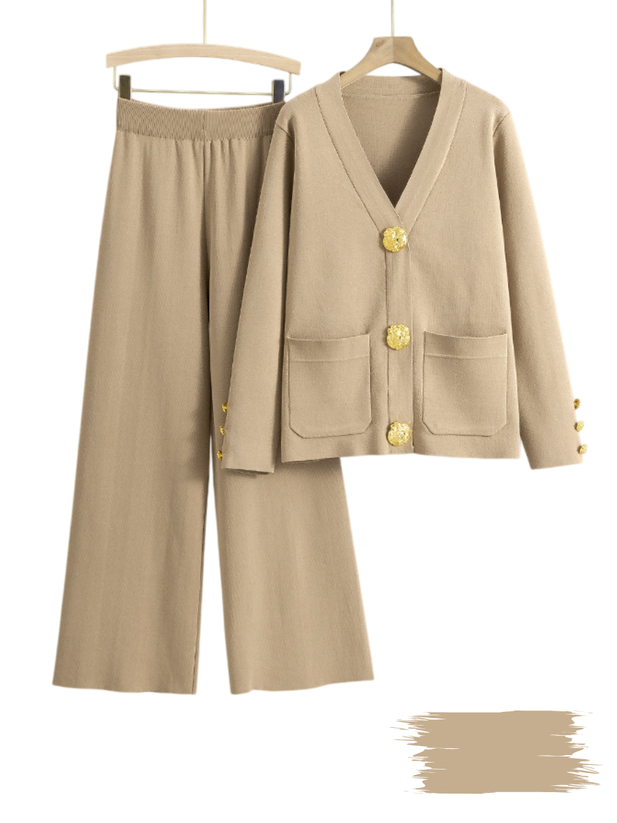 De Amara Noir gebreide set is de ideale keuze voor stijlvolle dames die comfort en mode willen combineren. Met een V-hals cardigan met gouden knopen en een broek met hoge taille en wijde pijpen biedt deze set een verfijnde uitstraling voor elke gelegenheid.